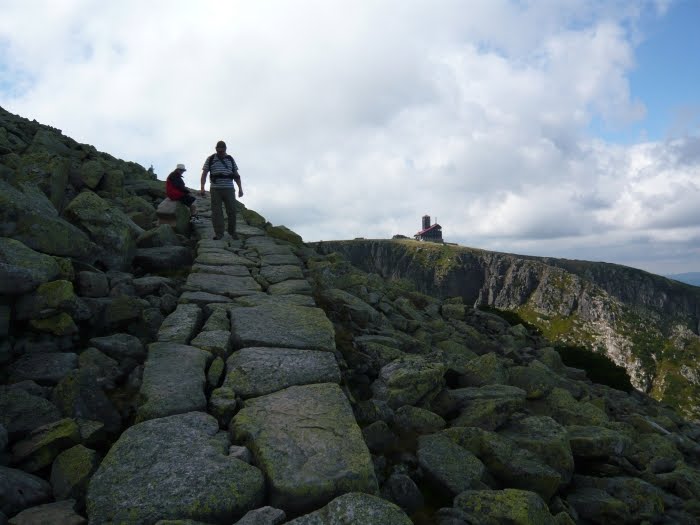 Via Bile Labe Bouda naar de Snezka, een probleem mijn zolen vielen onder mijn bergschoenen uit.Eerst de linker en na 6 km de rechter. Dus Daan alleen naar de top en toen 7,5 km zonder zolen terug naar Kubu, ik raad het niemand aan .